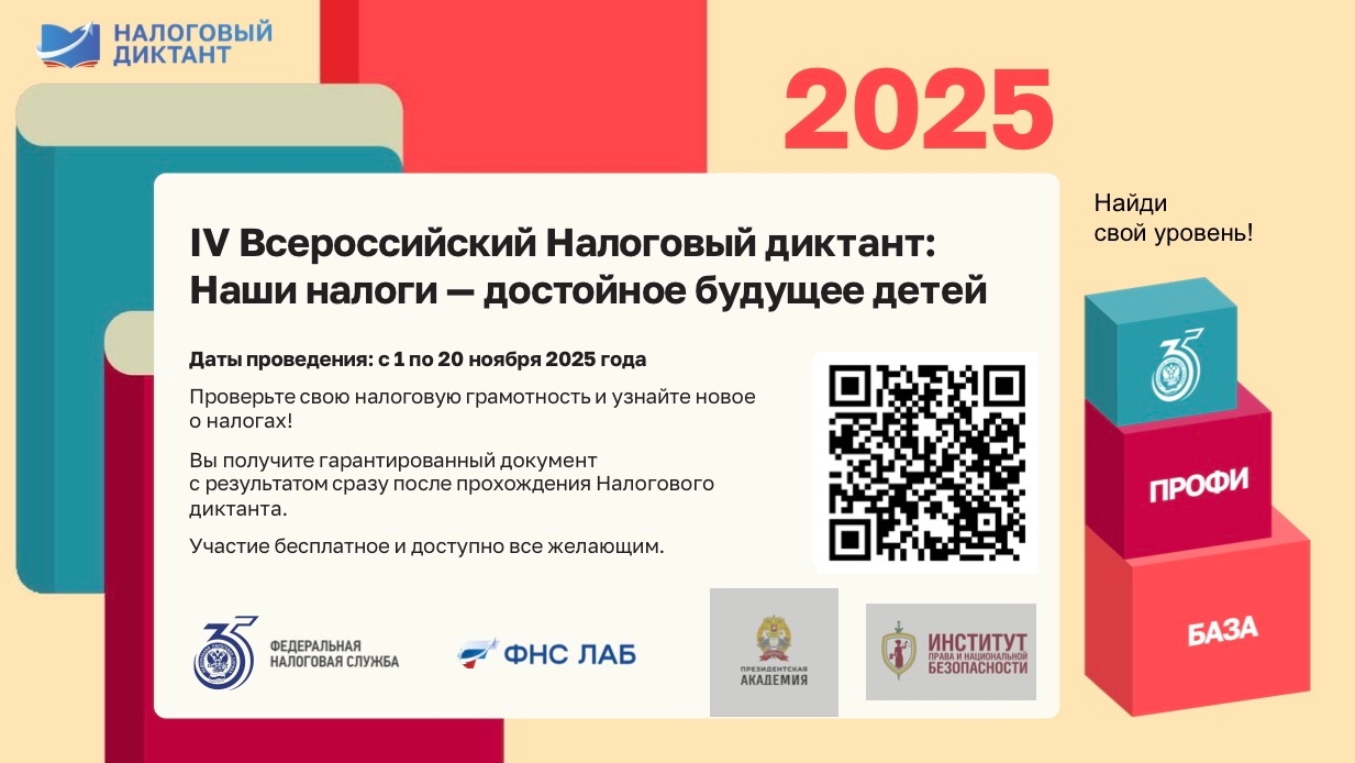 С 1 по 20 ноября в нашей школе проходило важное образовательное событие — IV Всероссийский Налоговый диктант «Наши налоги — достойное будущее детей». Акция проходила с 1 по 20 ноября 2025 года в онлайн формате. Участники могли выбрать один из трёх вариантов заданий: базовый уровень — 10 вопросов; продвинутый уровень — 25 вопросов; специальный блок (к 35 летию ФНС России) — 20 вопросов. Каждый смог подобрать подходящий уровень сложности и проверить свои знания в комфортной обстановке. Цель диктанта — не просто тестирование, а: развитие интереса к налоговым знаниям; приобщение к налоговой культуре; повышение финансовой грамотности школьников и взрослых. Это мероприятие стало отличной возможностью: узнать больше о налоговой системе России; разобраться в базовых принципах налогообложения; понять, как налоги влияют на развитие страны и качество жизни граждан. Мы благодарим всех, кто принял участие в Налоговом диктанте, и надеемся, что такие просветительские акции станут доброй традицией нашей школы!