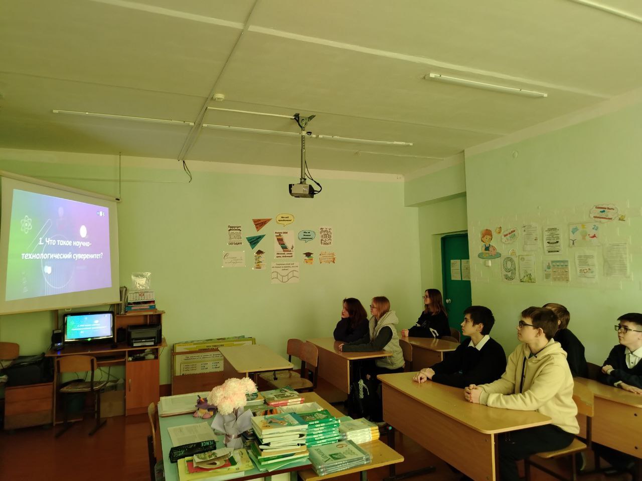 Во время занятия школьники провели игру-разминку «Что будет дальше?», где каждой команде необходимо было обсудить и презентовать свой сценарий решения проблемы. Узнали, насколько важны научные исследования и открытия для технологического суверенитета и устойчивого развития России.