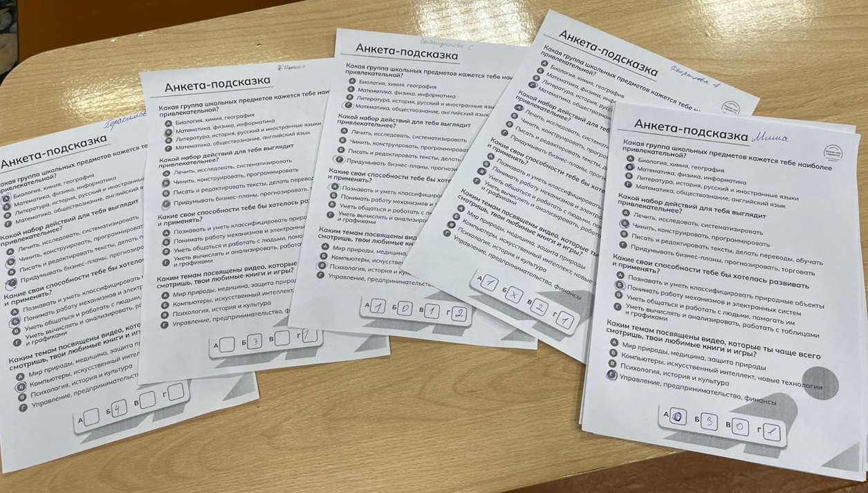 Сегодня, 11 сентября, учащиеся 6-11 классов постарались разобраться, как действовать при выборе профессии — как определить направление, в котором мы хотим работать. Все мы очень разные. У всех нас свои любимые предметы, интересы, свои склонности и увлечения. Важно об этом задумываться, размышлять, анализировать, обсуждать. Восьмиклассники, просмотрев видеоролики «Видеоролик «Знакомство с героями», «Консультация», «Подходящие профессии», «Погружение в профессию, перешли к анкете-подсказке, которую мы заполняли в начале занятия. Чтобы понять, какое направление нам ближе, мы посчитали, сколько у вас вариантов ответов А, Б, В и Г. Оказалось, что у трех учащихся три совпадения, у троих - два, у остальных нет совпадений.