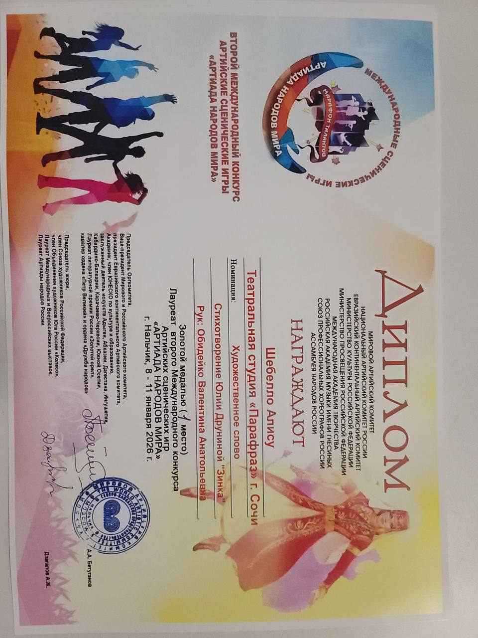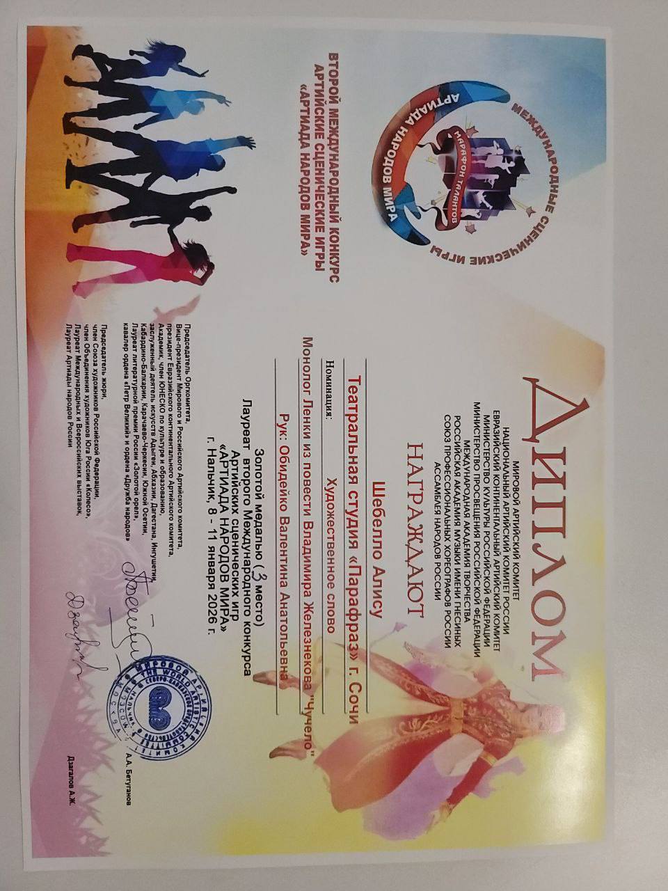 Я участвовала в конкурсе Международных Артийских сценических игр «Артиада народов мира». Когда я читала стихотворение Друниной "Зинка" и отрывок из повести Железнякова «Чучело», я представляла, что выступаю на сцене родного клуба в Буинске, как будто передо мной зрители, мои земляки. Наверно, поэтому я получила 1 место и 3 место. Я начала выступать в детском саду, потом в школе, клубе, на сцене районного ДК. Я с любовью вспоминаю родную школу, друзей, одноклассников. Мы пели, танцевали, играли, рисовали, маршировали, участвовали и побеждали в различных конкурсах, фестивалях, разрабатывали различные проекты, ходили в походы. Хочется сказать огромное спасибо Ольге Петровне, самому классному классному руководителю, за ее поддержку и наставничество, за умение понять и поддержать нас, подростков, в самых разных жизненных ситуациях, за умение превратить сложную науку математику в увлекательное занятие. В прекрасный мир танца ввела меня Наила Махмудовна, вы научили меня первым шагам танцевального искусства. Сейчас я продолжаю развиваться в студии танца и выступаю на различных площадках г.Сочи. Надежда Сергеевна, спасибо вам за любовь к русскому языку, русскому слову, за художественное слово. Я не подвела вас, успешно выступив на конкурсе. Ирину Геннадьевну благодарю за раскрытие моего художественного таланта. Как я любила ваши уроки рисования и занятия в художественной школе. Диана Басанэльевна, я готова маршировать не только на плацу школьного двора и районного Парада Победы, но и по другим дорогам нашей родины. Халиде Хасиятулловна, вы моя вторая мама навсегда! Сирина Миназымовна, спасибо вам за привитие любви к биологии, который стал одним из моих любимых предметов. Благодарю Татьяну Владимировну за то, что научила меня доделывать каждое дело до конца аккуратно и правильно! Мне до сих пор снятся сны, как я на ваших уроках разговариваю на чувашском языке. Во сне у меня получается это лучше. Спасибо Татьяне Николаевне, она подарила мне огромный интерес к истории, который связан со многими предметами. Спасибо Елене Сергеевне, директору Буинского ДК, именно она дала мне старт к новым возможностям на сцене! Наши учителя самые лучшие на свете! С благодарностью Алиса Ш.
